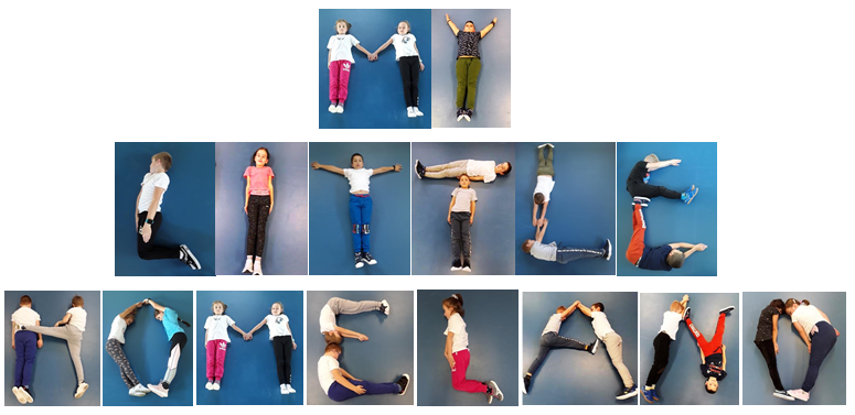 Naša snaha spracovať projektový plagát čo najoriginálnejším spôsobom pokračovala aj na hodine telesnej výchovy. Rozhodli sme sa názov nášho spoločného projektu vytvoriť z vlastných tiel: